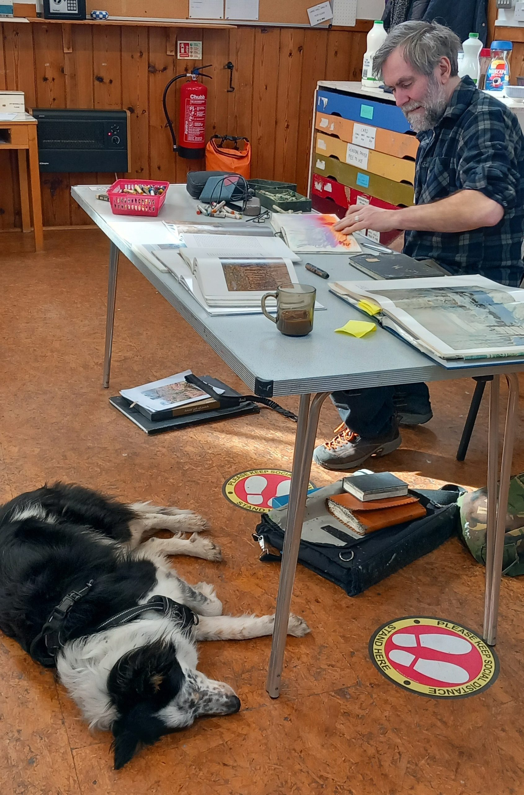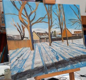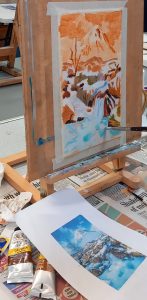 We had a very successful Workshop with Jonathan Shearer. The theme was winter landscapes as this workshop had been scheduled for January but even in the month of March it is still on the cool side. As ever Jonathan the member lots of tuition and tips and he brought various books for us to see artists different styles of painting winter scenes. Members had chosen a great selection of pictures to paint. We also had a visit from Jonathan’s lovely dog Cory, who really relaxed into the environment once he had met everyone.